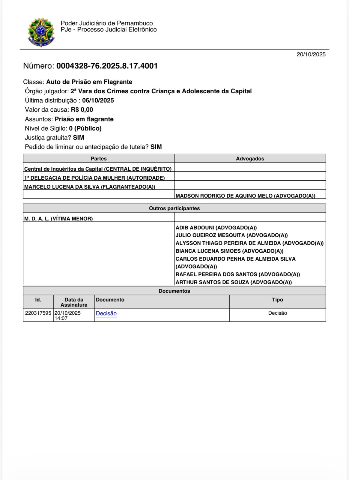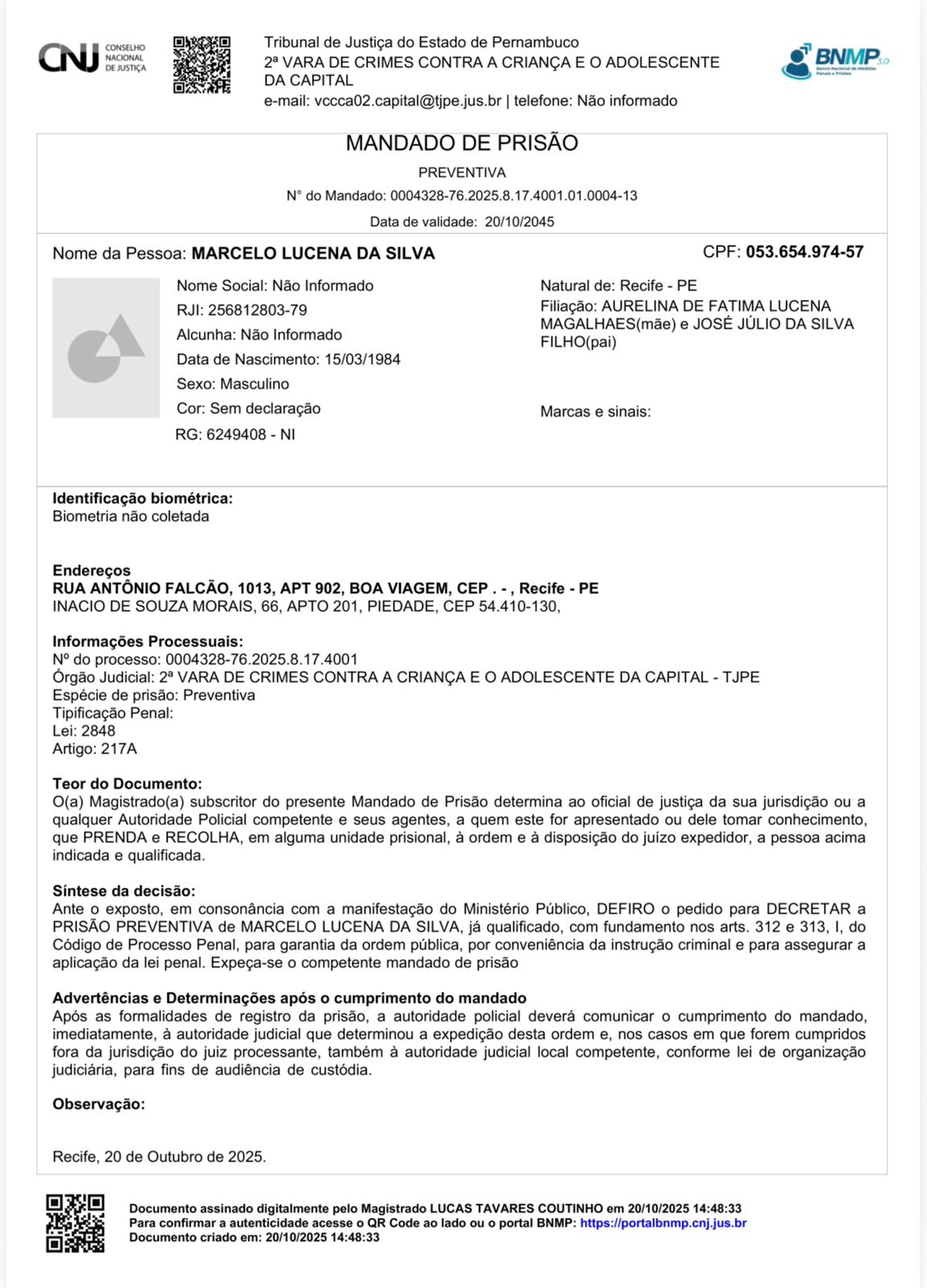 Por Ricardo Antunes – O juiz Lucas Tavares Coutinho, da 2ª Vara dos Crimes contra a Criança e Adolescente, revogou a decisão do seu colega Roberto Jordão de Vasconcelos, de plantão na mesma Vara no último dia 5, e decretou, nesta segunda-feira (20), a prisão preventiva do contrabandista Marcelo Lucena da Silva, 41 anos, preso em flagrante por abuso sexual do filho de cinco anos.