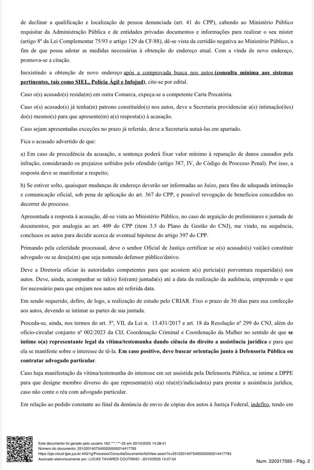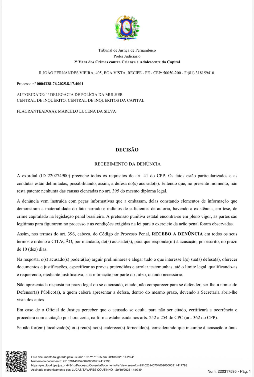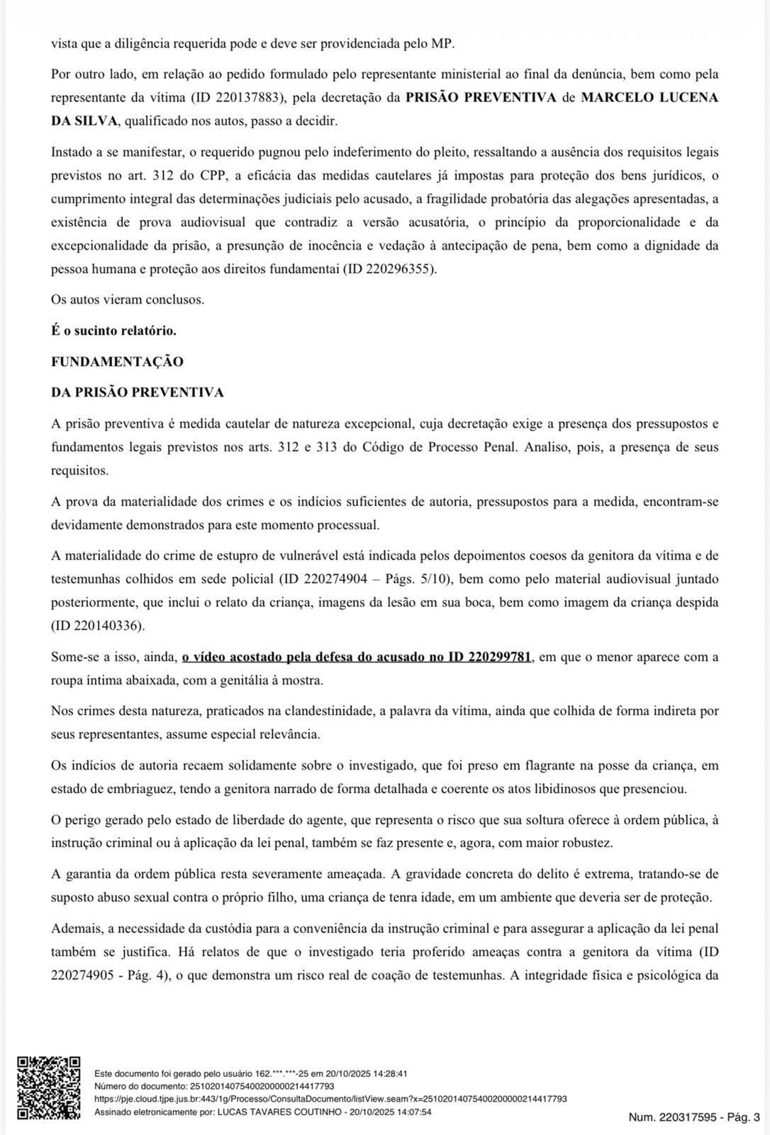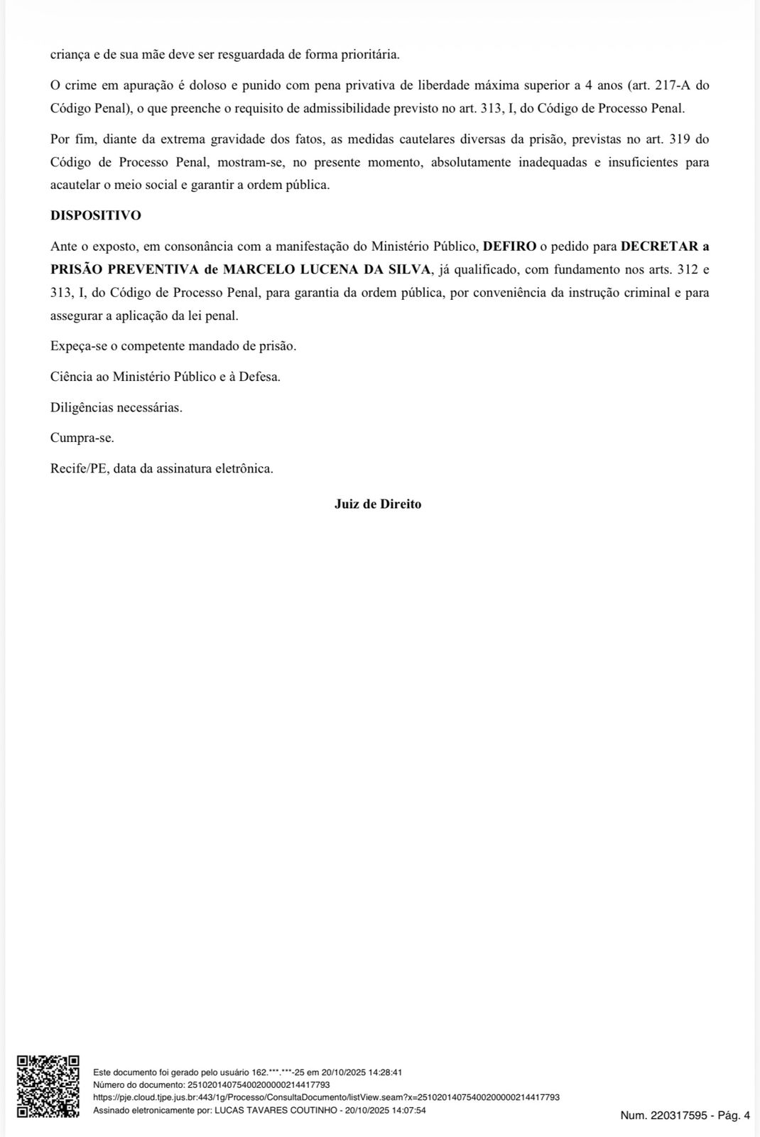 Lucas Tavares Coutinho escreveu, na decisão, que “o perigo gerado pelo estado de liberdade do agente” (Marcelo Lucena da Silva), “que representa o risco que sua soltura oferece à ordem pública, à instrução criminal ou à aplicação da lei penal, também se faz presente e, agora, com maior robustez”.