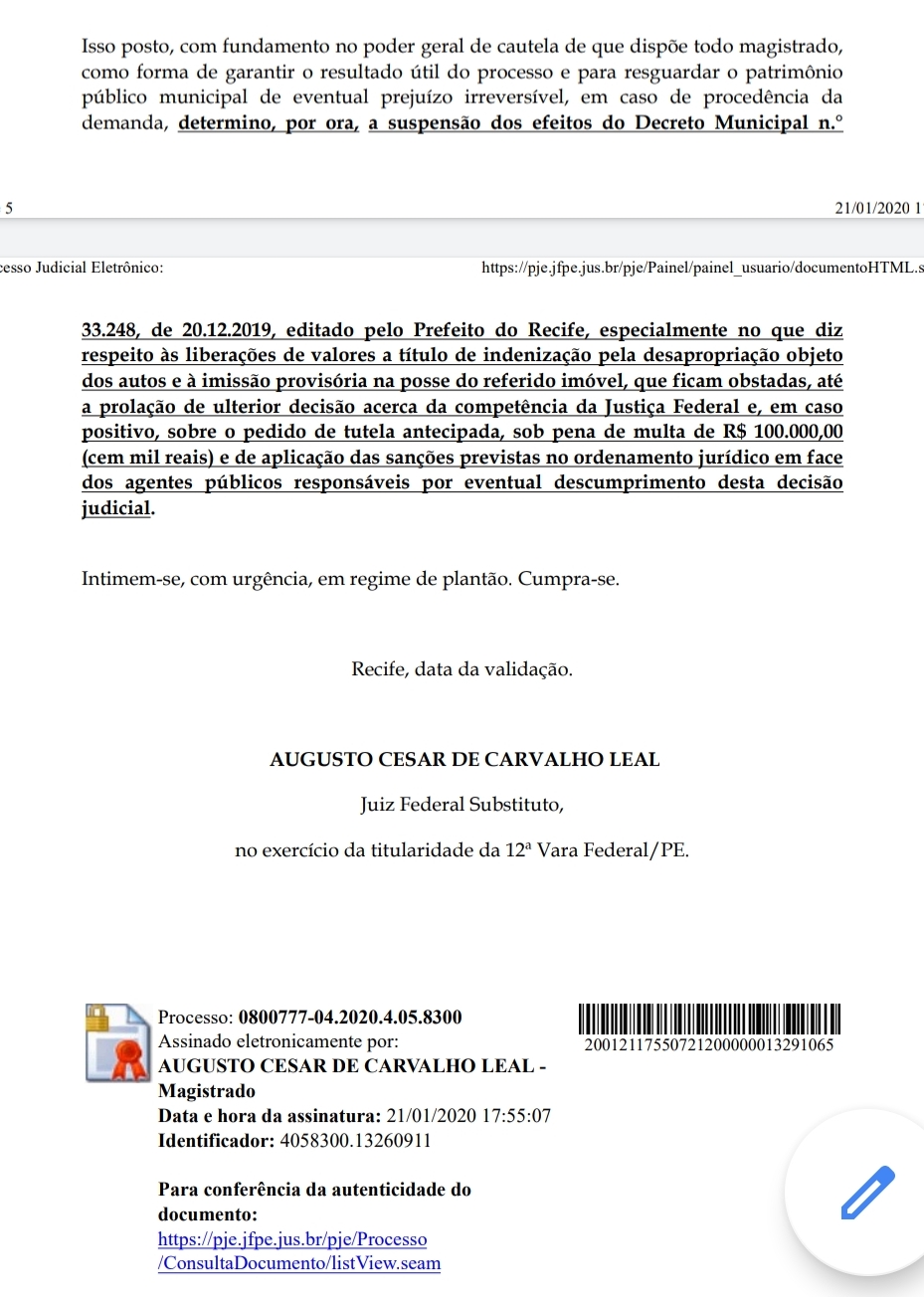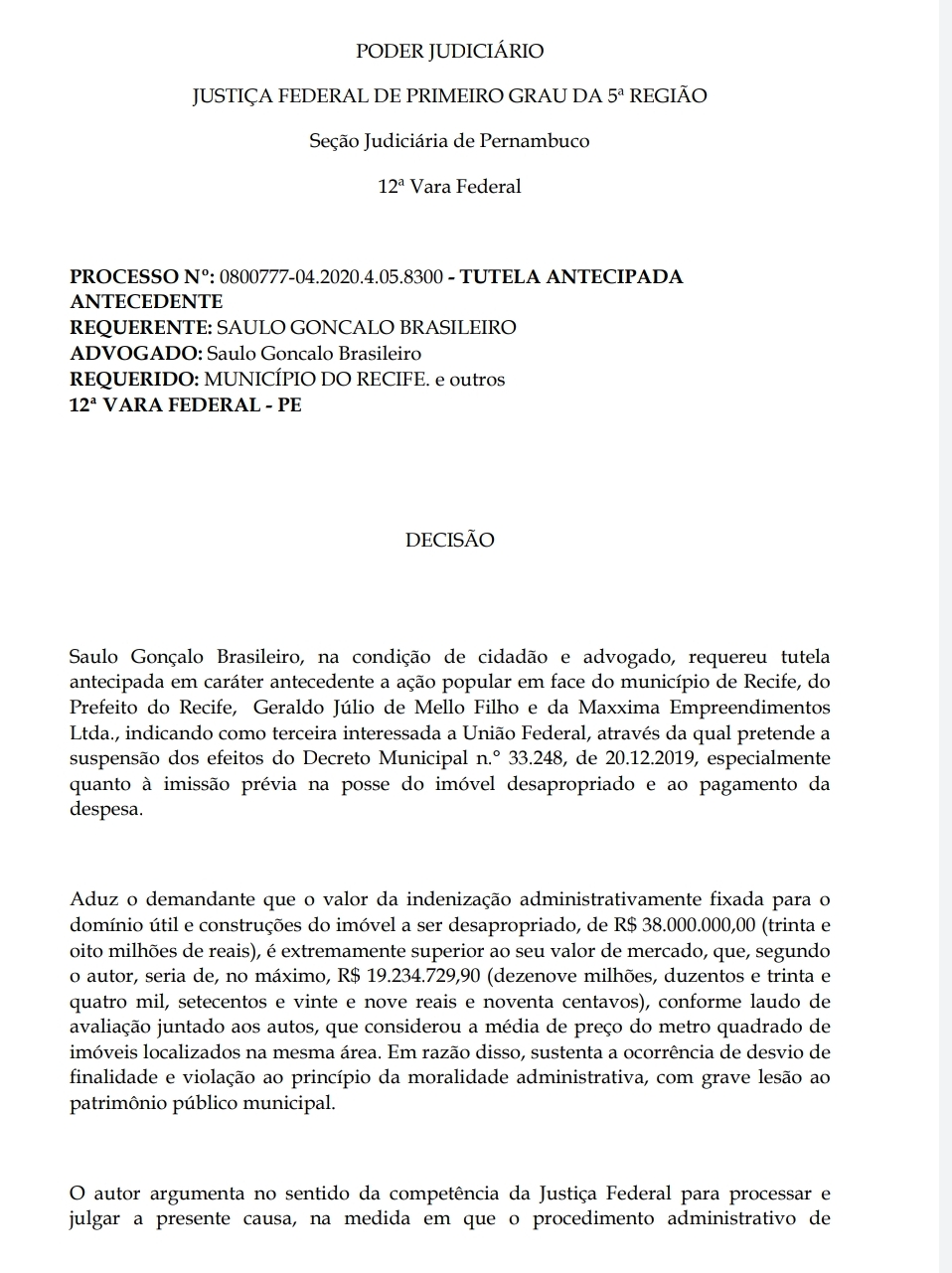 O juiz federal AUGUSTO CESAR DE CARVALHO LEAL Substituto, no exercício da titularidade da 12ª Vara Federal/PE, acaba de conceder liminar na ação movida pelo advogado Saulo Brasileiro, determinando a suspensão da desapropriação de um imóvel prla gestão Geraldo Julio, por suspeita de superfaturamento apontado em Laudo do perito Rafael Dantas.