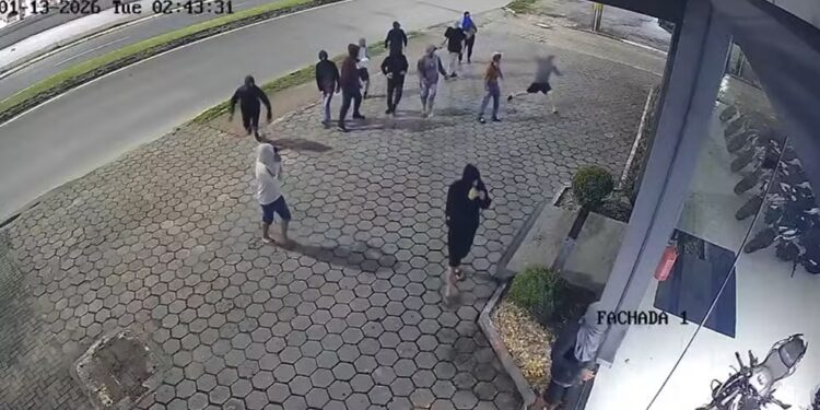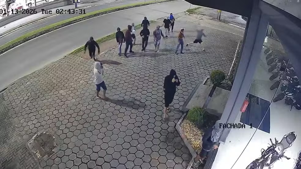 Da Redação do Blog — Na madrugada de terça-feira (13), 14 ladrões encapuzados invadiram uma loja de motocicletas em Itajaí, Santa Catarina, e fugiram com 12 motos. O vídeo mostra um criminoso preso na fachada e outro que caiu com uma das motos. As chaves estavam nas ignições para facilitar o acesso.