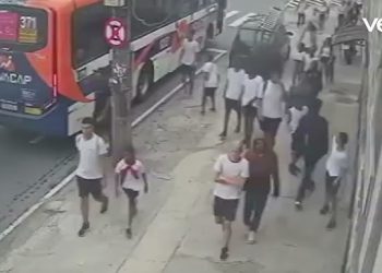 Da Veja — Câmeras de segurança flagram estudantes, que vestiam uniformes escolares, roubando celulares na Zona...