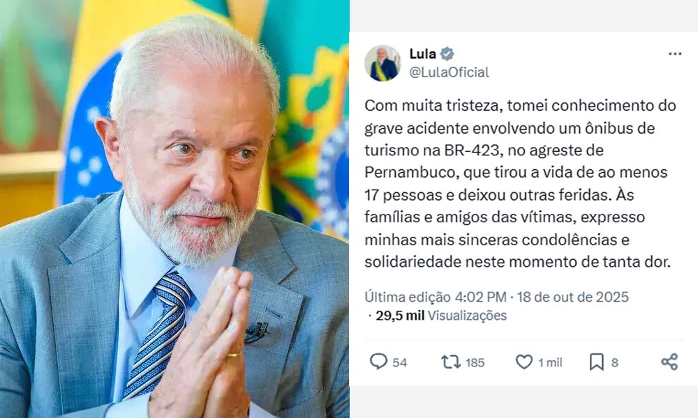 Da Redação do Blog — O presidente Luiz Inácio Lula da Silva publicou, nas redes sociais, uma mensagem em que lamenta o acidente de ônibus que deixou ao menos 17 mortos na BR-423, em Saloá, na noite desta sexta-feira (17).