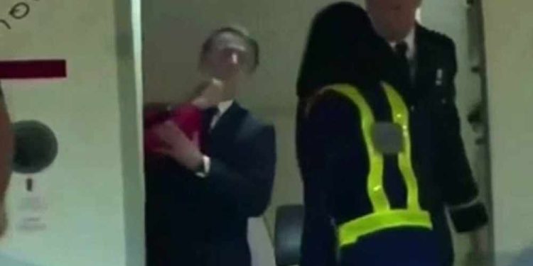 As imagens capturam o momento em que a porta do avião presidencial se abre e Macron, aparentemente distraído, está envolvido em uma discussão. É então que os braços de sua esposa surgem, colocando as duas mãos no rosto do marido e o empurrando. Macron pareceu surpreso, virou-se rapidamente e acenou para a imprensa. Ao descer as escadas do avião, o presidente estendeu o braço para Brigitte, um gesto habitual, mas ela não o aceitou.