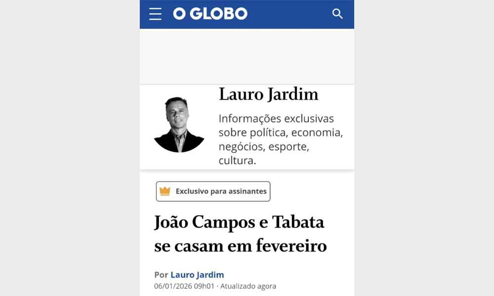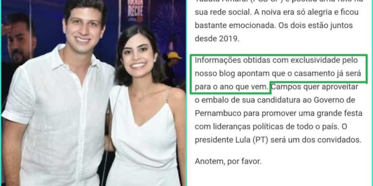 Por Ricardo Antunes — Agora é oficial: o prefeito do Recife, João Campos (PSB-PE), e a deputada federal Tabata Amaral (PSB-SP) vão se casar no fim de fevereiro. A informação foi publicada nesta terça-feira (06) pelo colunista Lauro Jardim, no Globo, e confirma o que o Blog já havia antecipado há mais de um mês.