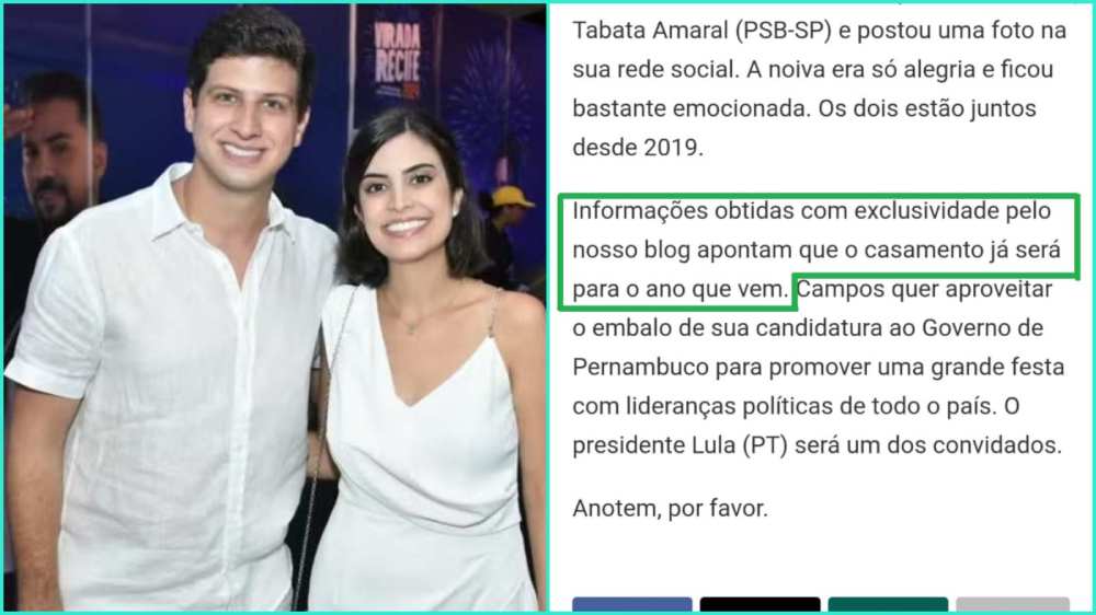 Por Ricardo Antunes — Agora é oficial: o prefeito do Recife, João Campos (PSB-PE), e a deputada federal Tabata Amaral (PSB-SP) vão se casar no fim de fevereiro. A informação foi publicada nesta terça-feira (06) pelo colunista Lauro Jardim, no Globo, e confirma o que o Blog já havia antecipado há mais de um mês.