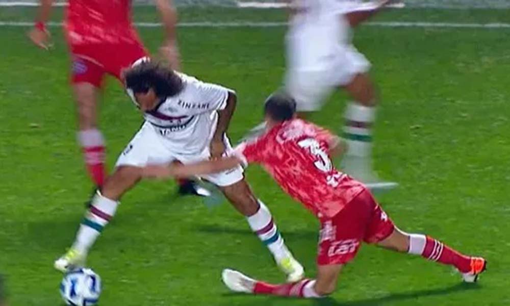 Aos dez minutos do 2° tempo, o argentino tentou desarmar uma bola que era, até então, dominada por Marcelo.