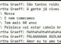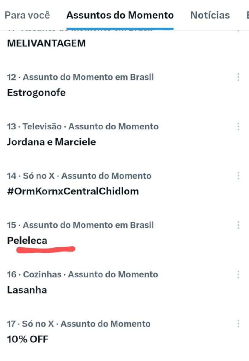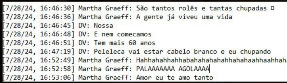 Em seguida, Vorcaro digita e envia a mensagem e diz que a “peleleca vai estar com cabelo branco e eu chupando”. O teor da mensagem do casal viralizou nas redes socias, nesta sexta-feira (6), e foi um dos mais comentados, no X (antigo Twitter). A palavra “peleleca” entrou na posição de 15º dos temas mais abordados na plataforma digital.