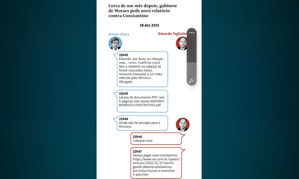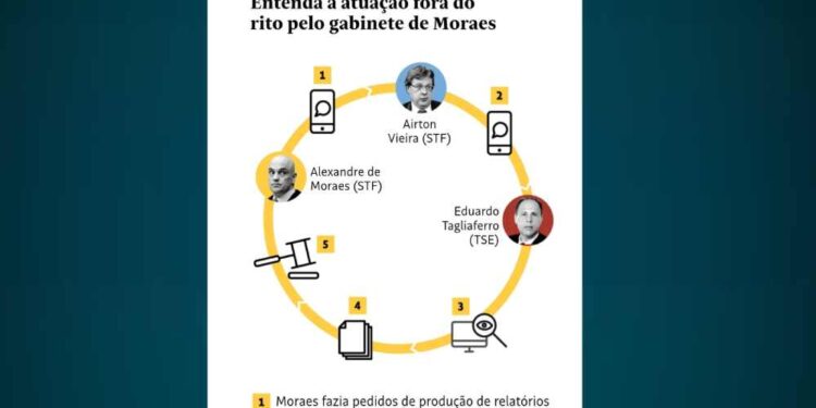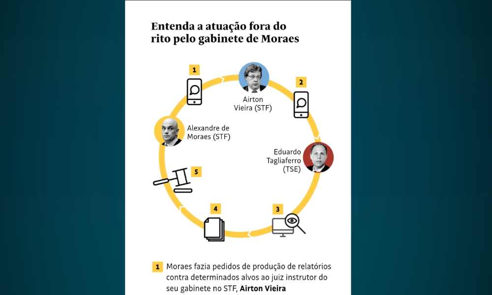 Reportagem da Folha de S. Paulo denuncia que Moraes usou o TSE fora do rito. De acordo com a publicação, seu gabinete no STF ordenou por mensagens e de forma não oficial a produção de relatórios pela Justiça Eleitoral para embasar decisões do próprio ministro contra bolsonaristas no inquérito das fake News no STF durante e após as eleições de 2022.