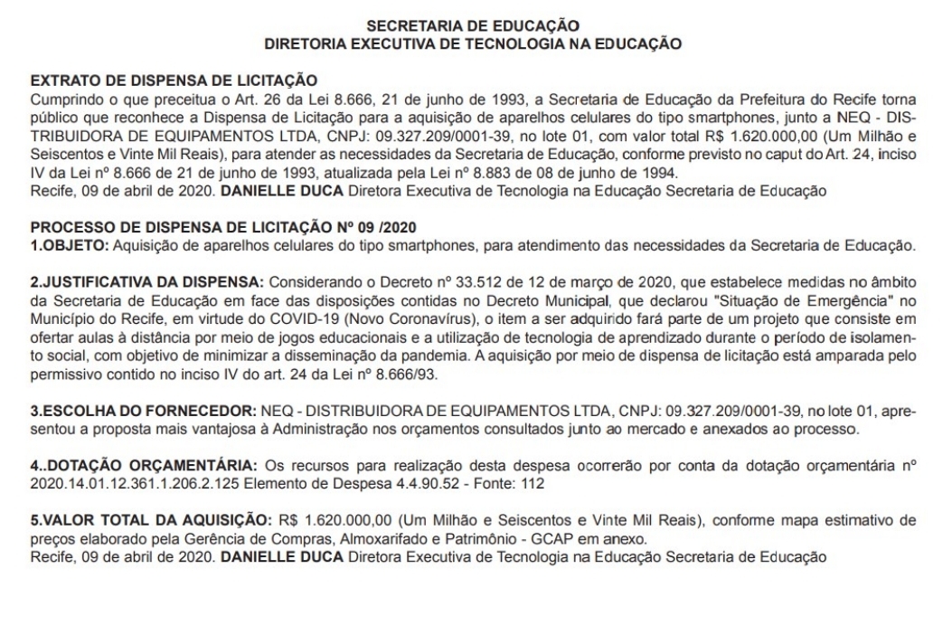 A justificativa para a dispensa emergencial foi: “Considerando o Decreto 33.512 de 12 de março de 2020, que estabelece medidas no âmbito da Secretaria de Educação em face das disposições contidas no Decreto Municipal, que declarou ‘Situação de Emergência’ no Município do Recife, em virtude do COVID-19 (Novo Coronavírus), o item a ser adquirido fará parte de um projeto que consiste em ofertar aulas à distância por meio de jogos educacionais e a utilização de tecnologia de aprendizado durante o período de isolamento social, com objetivo de minimizar a disseminação da pandemia. A aquisição por meio de dispensa de licitação está amparada pelo permissivo contido no inciso IV do art. 24 da Lei 8.666/93”.