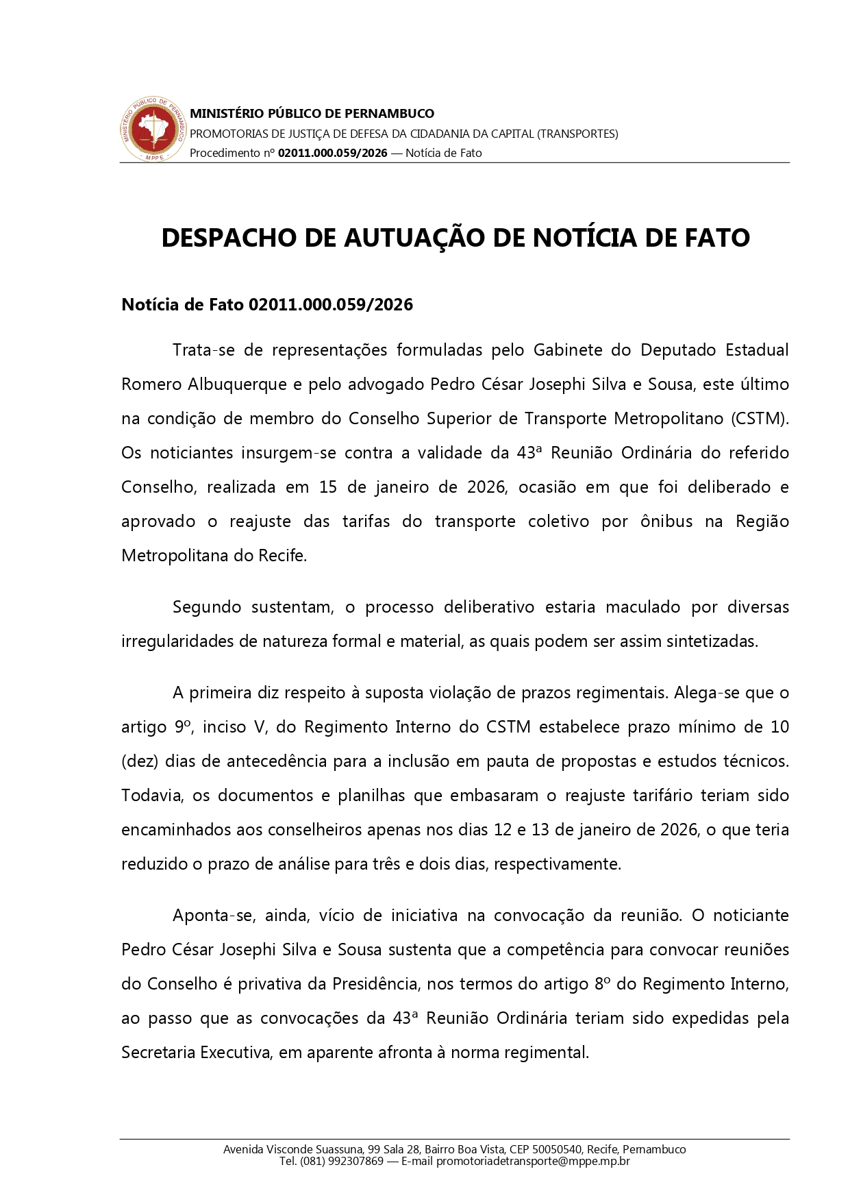 Da Redação do Blog – O Ministério Público de Pernambuco (MPPE) aceitou pedidos da Frente de Luta pelo Transporte Público de Pernambuco e do deputado estadual Romero Albuquerque (União) e vai investigar denúncia de ambos de ter sido ilegal a concessão do reajuste de 4,6% nas passagens de ônibus na Região Metropolitana do Recife, aprovada na quinta-feira (15) pelo Conselho Superior de Transporte Metropolitano (CSTM).