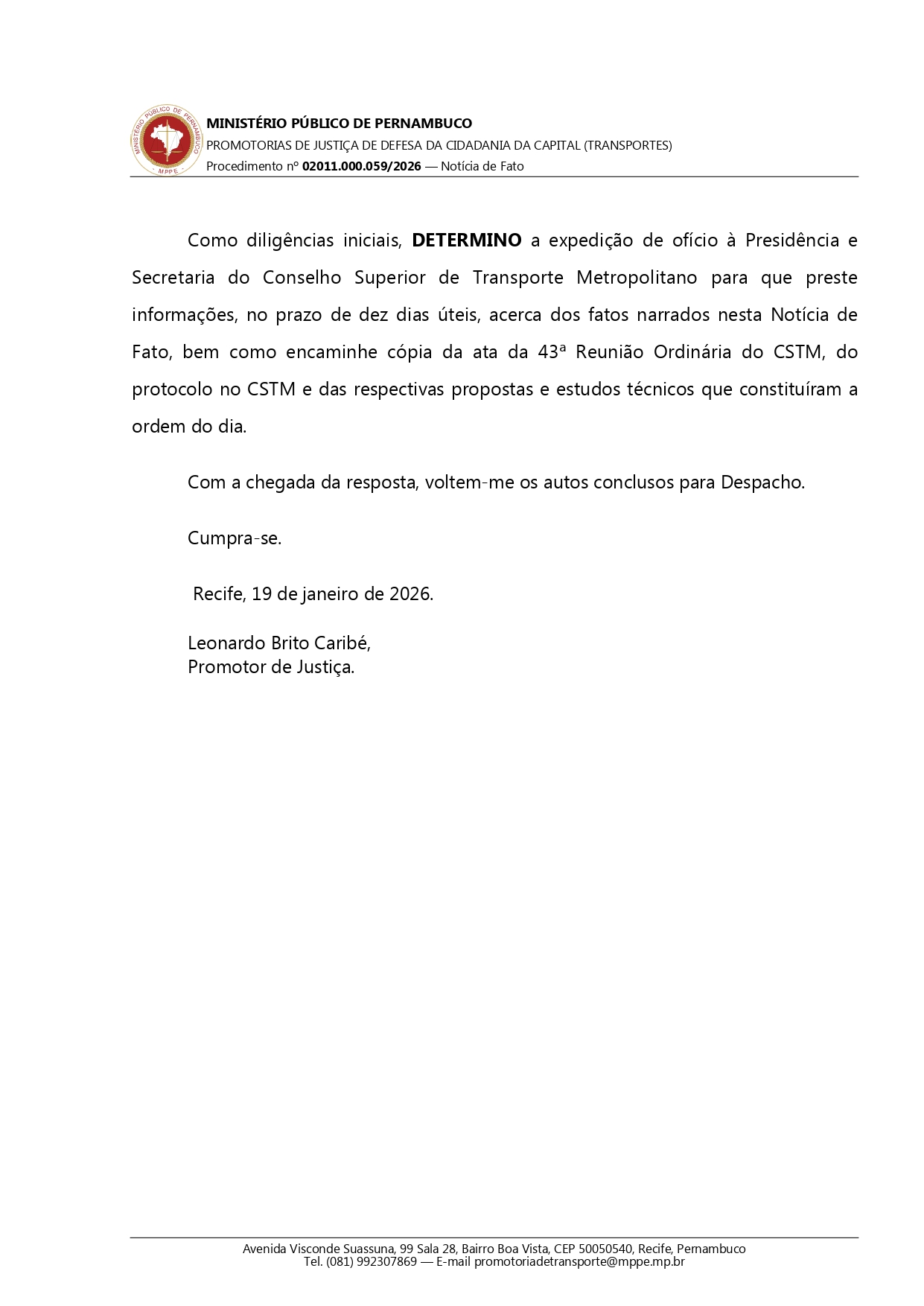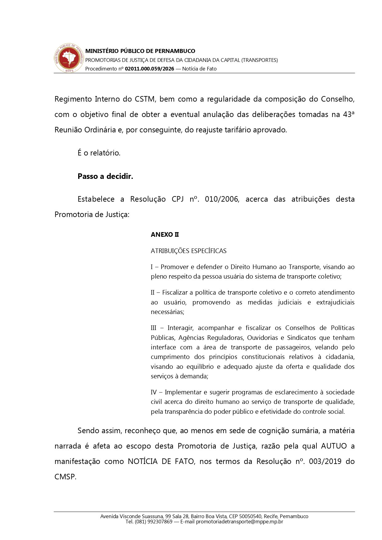 Alegou ainda Pedro Josephi que, em decisão monocrática do presidente em exercício do CSTM, Pedro Neves, secretário-executivo de Mobilidade e Infraestrutura do governo, foram negadas questão de ordem e pedido de vistas na reunião, convocada pela secretaria executiva do CSTM, e não pelo presidente do Conselho, outras duas ilegalidades ao regimento arroladas na representação ao MPPE.