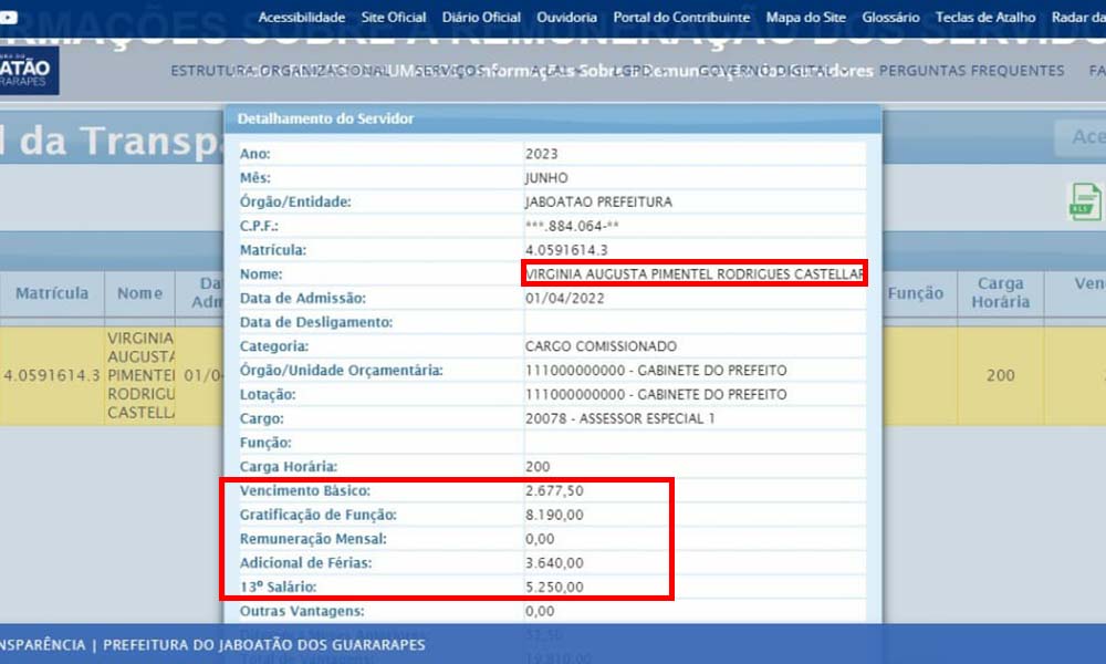 Segundo dados do Portal da Transparência da prefeitura de Jaboatão, Virginia Castellar tem um cargo comissionado e atua diretamente no gabinete de Mano Medeiros.