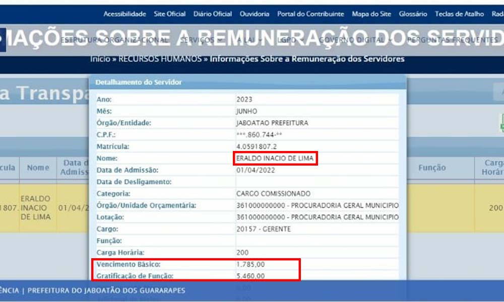 Tem um salário de R$ 2,5 mil e uma gratificação de mais de R$ 8 mil. Eraldo Lima tem um cargo na Procuradoria do Municipal e recebe gratificações e salários que somam mais de R$ 7 mil por mês.