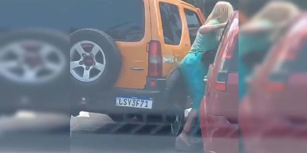 As imagens mostram a mulher sinalizando e batendo no vidro de um Fiesta vermelho, com outro Suzuki Jimny amarelo, aparentemente o dela, parado na frente. Em seguida, o motorista do carro vermelho parece tentar sair do local e ela se coloca na frente dele. O carro, entretanto, arranca com a mulher em cima.