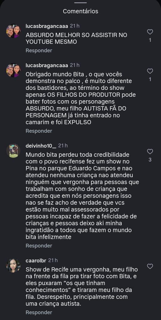 As reclamações contra o comportamento da produção do Mundo Bita pipocaram nas redes sociais. Outro perfil, delvinho10_ , postou: “Mundo bita perdeu toda a credibilidade com o povo recifense”.