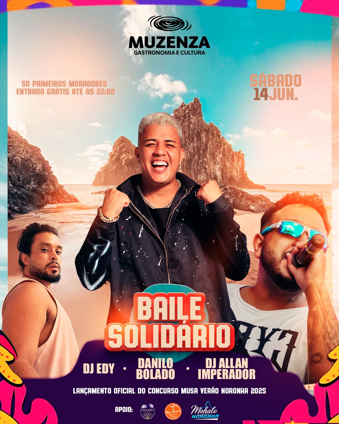 Da Redação do Blog – O sábado, 14 de junho, promete ser inesquecível em Fernando de Noronha. O Muzenza Gastronomia e Cultura será palco do Baile Solidário, uma festa que vai misturar música, moda e solidariedade. A entrada é gratuita até as 22h para os primeiros moradores da ilha, e o evento contará com os DJs Edy, Danilo Blado e Allan Imperador no comando do som.