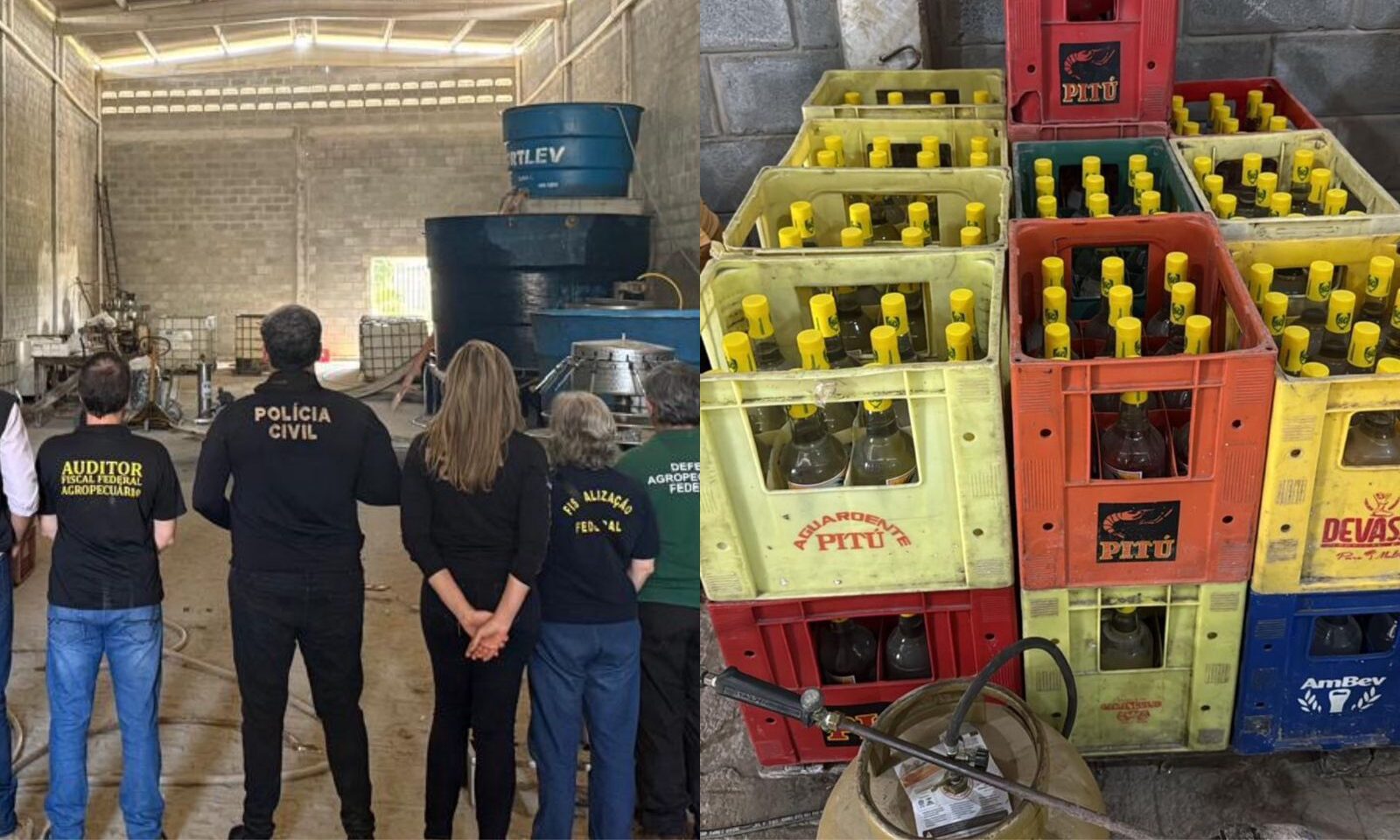 Em dois galpões, um usado para a lavagem e remoção de rótulos de garrafas usadas e o outro destinado ao envasamento de novos produtos, a polícia apreendeu 40 mil litros de substância etílica.