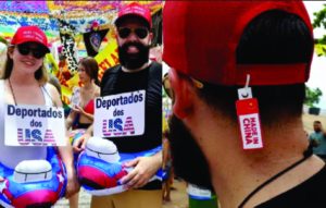 Brincando nas ladeiras de Olinda, eles se vestiram como “deportados dos EUA”, usando bonés vermelhos com a frase “Made America Great Again”, mas com uma ironia estampada: a etiqueta “Made in China”, em referência ao país comunista que disputa a hegemonia mundial com os norte-americanos.