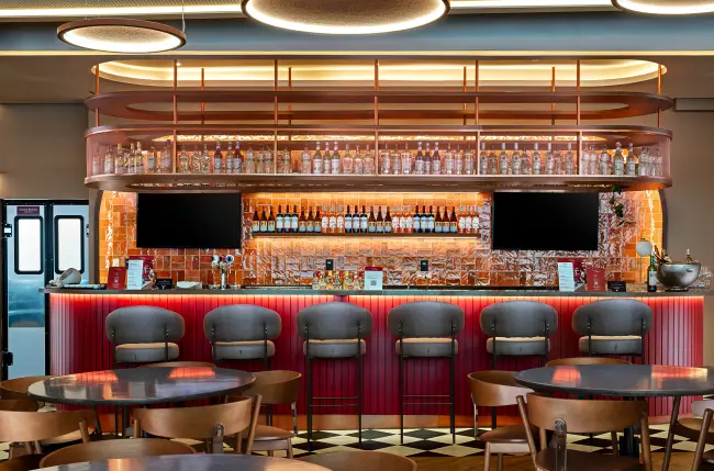 O lounge traz referências diretas à identidade de São Paulo. O bar tem piso quadriculado em estilo Art Déco, evocando elementos originais do Aeroporto de Congonhas da década de 1960.
