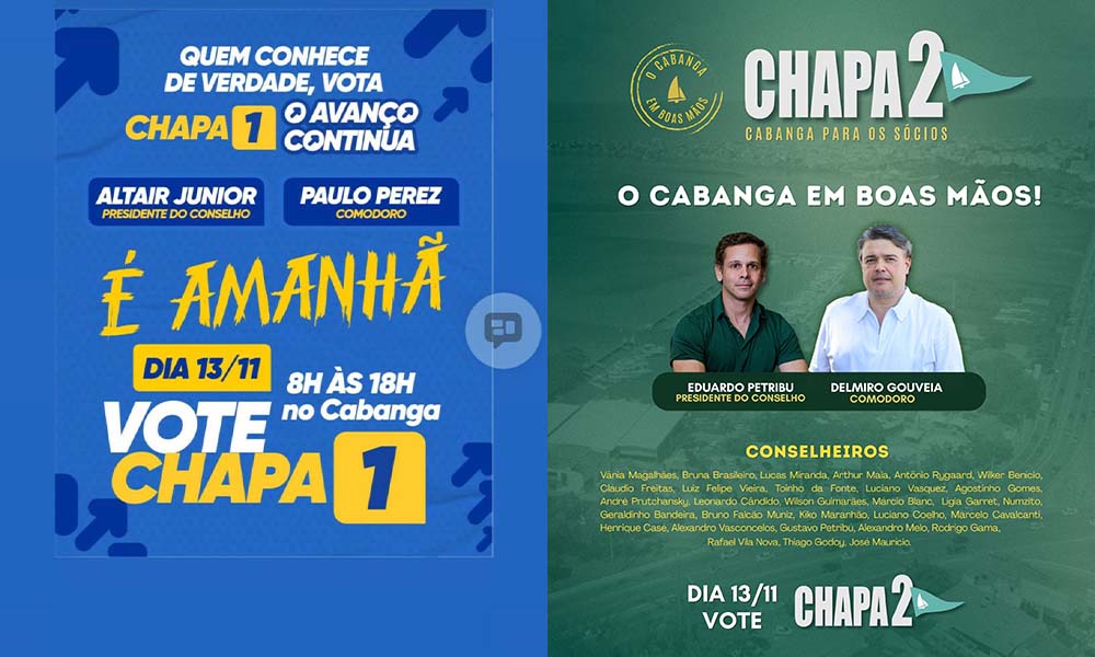 De um lado está a chapa 1 – “O Avanço Continua”, encabeçada por Altair Junior (para o Conselho) e Paulo Perez (para Comodoro), que tentam se manter no poder. Do outro, surge a chapa 2 – “Cabanga para os Sócios: Menos despesas, mais realizações”, formada por Eduardo Petribu e Delmiro Gouveia, que entraram na corrida de última hora para tentar barrar a dupla e prometer uma gestão mais econômica.