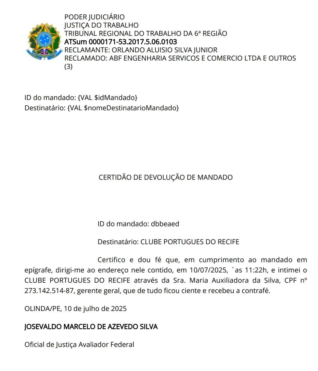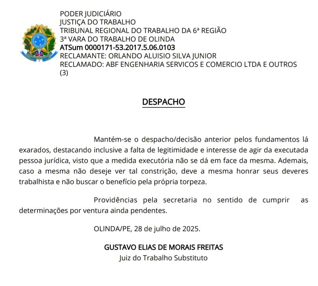 A 3ª Vara do Trabalho de Olinda, na Região Metropolitana do Recife, decretou, em 1º de julho de 2022, a penhora do título de Fernando Medicis Pinto e a proibição de sua utilização atendendo a uma reclamação trabalhista contra sua construtora, ABF Engenharia, em recuperação judicial. Em 10 de julho último – 20 dias antes, portanto, da assembleia geral que votou o megaprojeto –o Clube Português foi intimado, às 11h22, da decisão.