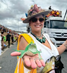 Já a artista Letícia está na Truck desde o primeiro desfile, quando foi às ruas curtir como foliona. Mas a paixão a puxou para dentro da corda. Já na segunda ida, Letícia entrou de vez no bloco e hoje é uma das “sapas” que lotaram o brejo.