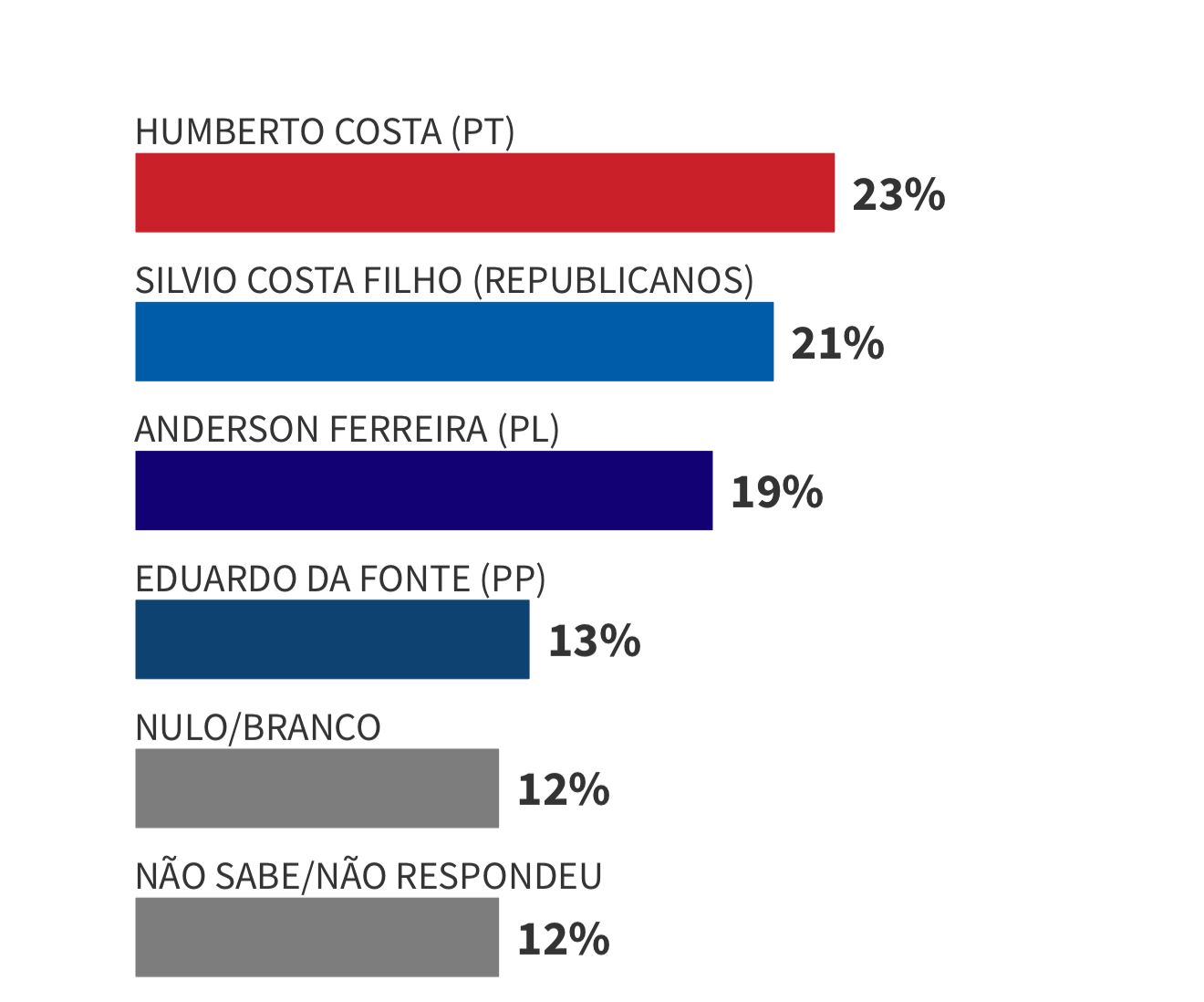 O senador Humberto Costa (PT-PE) lidera as intenções de voto de um primeiro quadro, com 23%. Na sequência, o ministro de Portos e Aeroportos, Silvio Costa Filho (Republicanos), aparece com 21% dos votos.