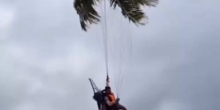 O piloto de paramotor ficou preso em um coqueiro, necessitando da intervenção rápida da equipe, que chegou de helicóptero para realizar a operação.