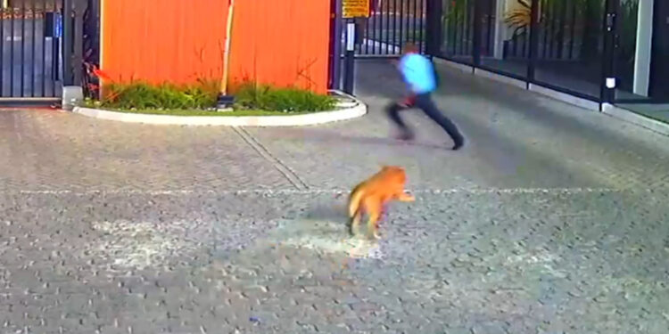 Enquanto o funcionário é atacado, um morador se aproxima e chuta o cachorro. Depois de cinco pessoas serem atacadas, o animal é preso dentro de uma quadra esportiva.