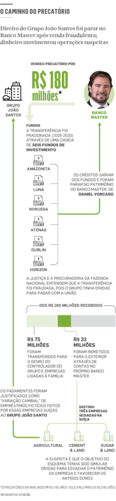 A operação envolve um precatório bilionário do Grupo João Santos, um dos maiores conglomerados do País até o início dos anos 2000, que foi parar no banco de Vorcaro após ser vendido por menos de 20% do valor pelo qual era avaliado. Trata-se de um direito creditório — ou, no jargão financeiro, um “pré-precatório”. É um dinheiro que uma empresa tem para receber da União e cujo processo ainda não tramitou de forma definitiva na Justiça.