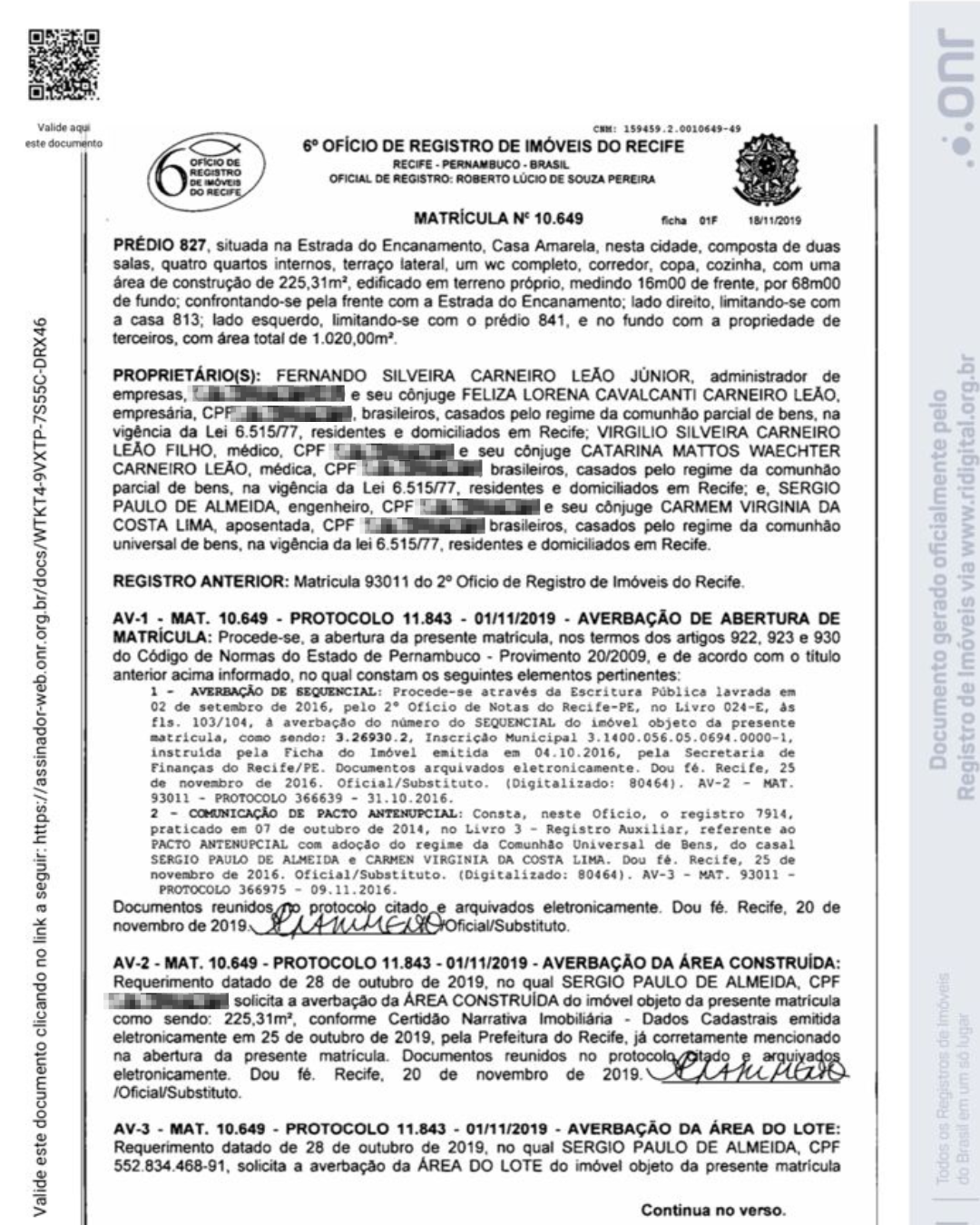 Certidão do 6º Ofício de Registro de Imóveis informa que a construtora Haut averbou, em 5 de dezembro de 2022, a demolição da casa existente no número 887 da Estrada do Encanamento. De acordo com vizinhos, a imagem do ESIG com a casa demolida seria a comprovação de que o prédio erguido no local não estaria registrado em cartório.