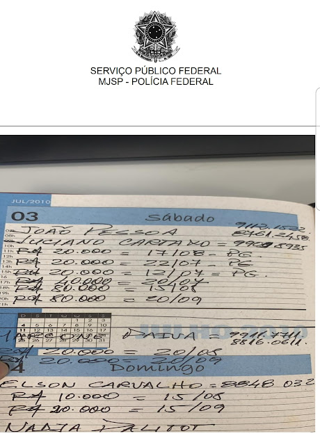 Segundo o Relatório de Diligências da Operação Pés de Barro, foi encontrada uma “Agenda contendo anotações de pagamentos para personalidades politicamente proeminentes do Estada da Paraíba, sendo citados Deputados, prefeitos, ex-prefeitos e vereadores ligados a 62 municípios em ordem alfabética e respectivos valores, conforme, exemplificativamente, imagem abaixo, em que é citado o atual prefeito de João Pessoa/PB, Luciano Cartaxo, seguido de cifras que totalizam o montante de R$ 260.000,00 (item 17 do auto de apreensão nº 409/2019):”
