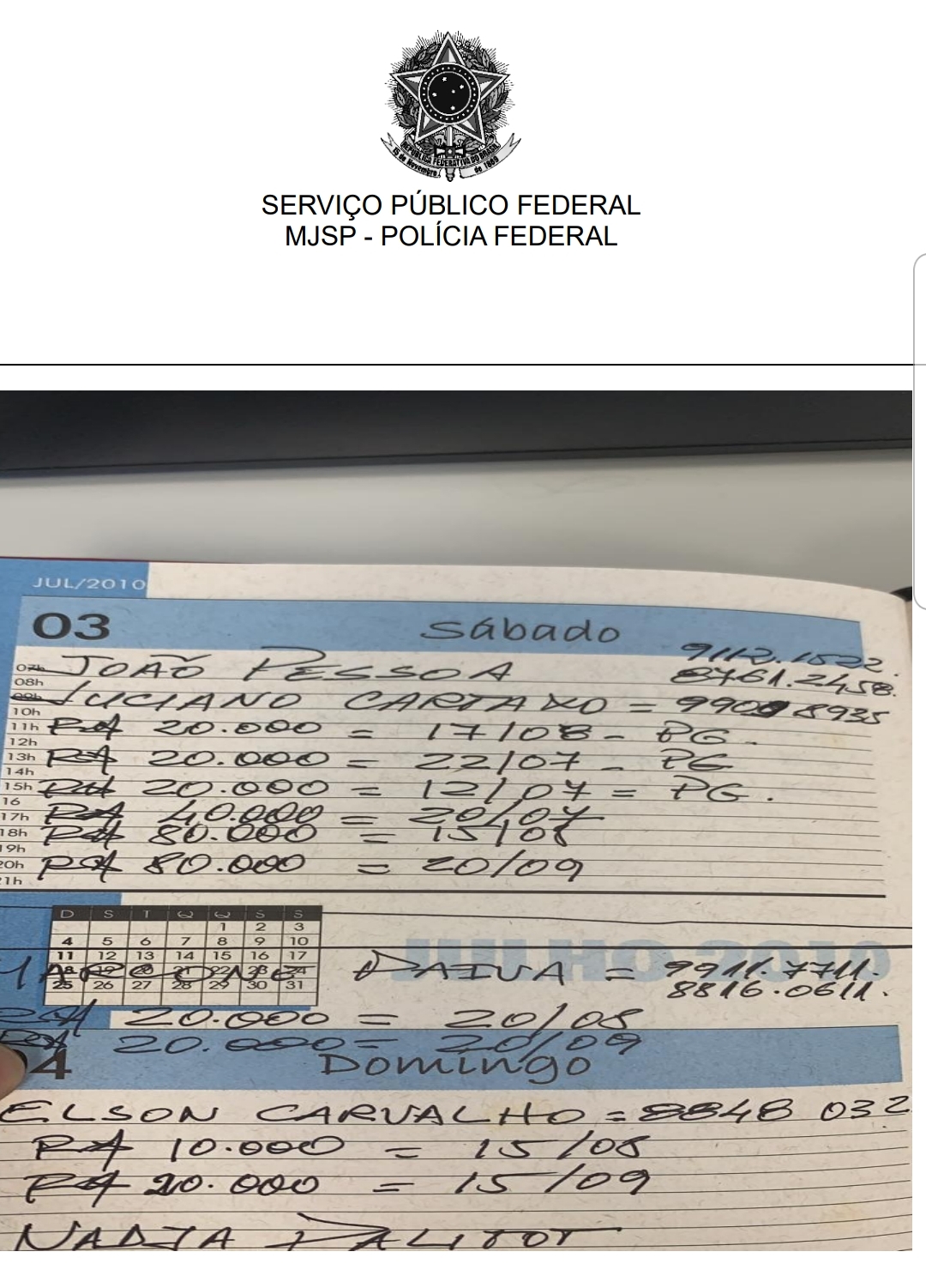 Segundo o Relatório de Diligências da Operação Pés de Barro, foi encontrada uma “Agenda contendo anotações de pagamentos para personalidades politicamente proeminentes do Estada da Paraíba, sendo citados Deputados, prefeitos, ex-prefeitos e vereadores ligados a 62 municípios em ordem alfabética e respectivos valores, conforme, exemplificativamente, imagem abaixo, em que é citado o atual prefeito de João Pessoa/PB, Luciano Cartaxo, seguido de cifras que totalizam o montante de R$ 260.000,00 (item 17 do auto de apreensão nº 409/2019):”