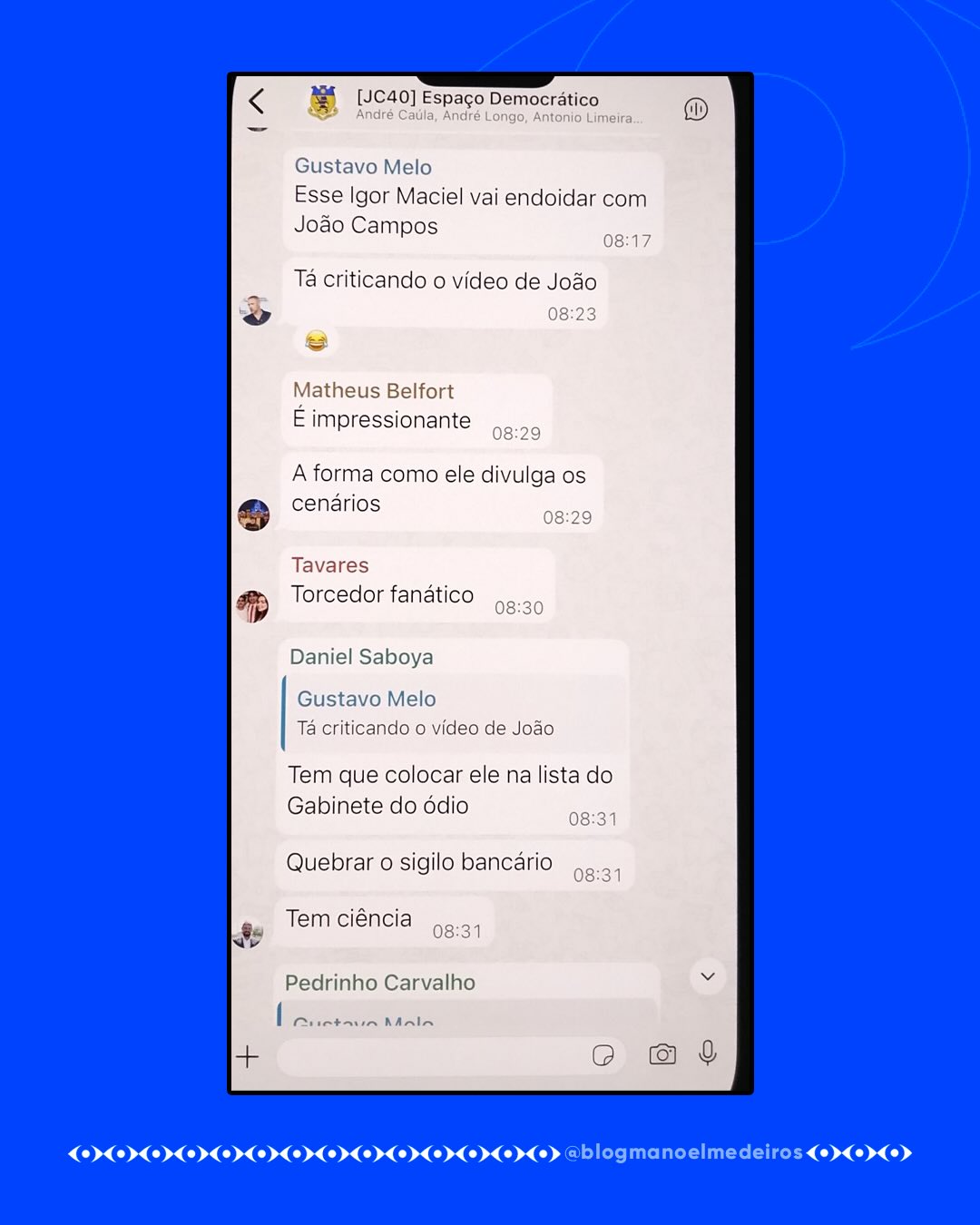 Às 8h17 da sexta-feira, Gustavo Melo, teria escrito: “Esse Igor Maciel vai endoidar com João Campos”. Seis minutos depois, ele teria acrescentado: “Tá criticando o vídeo de João”. Às 8h31, em resposta ao suposto conteúdo de Melo, Daniel Saboya teria escrito: “Tem que colocar ele na lista do Gabinete do ódio. Quebrar o sigilo bancário”.