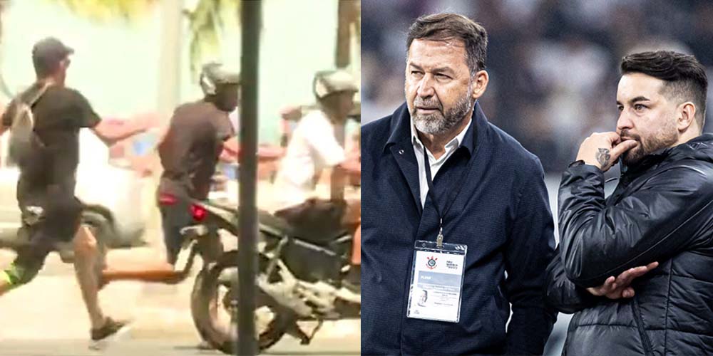Dois homens em uma moto tentaram arrancar a corrente de um segurança do presidente, quase em frente ao hotel em que a delegação do Timão está hospedada para a partida contra o Flamengo, pela Copa do Brasil. O item foi recuperado, e pessoas que estavam com Augusto Melo tentaram correr atrás dos criminosos, que fugiram em velocidade.