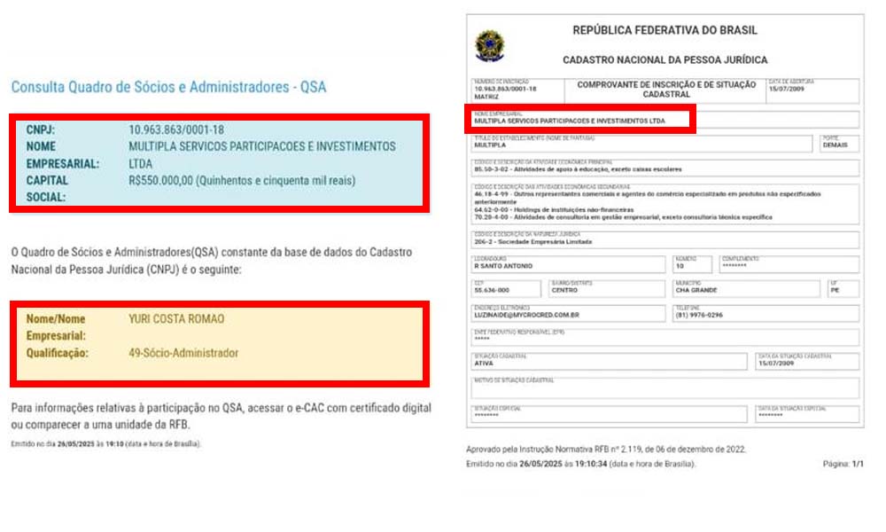 De acordo com a denúncia, a Múltipla está registrada na Receita Federal com capital de R$ 550 mil, enquanto é de R$ 60 mil o capital social da LCR Sports. A outra sócia de Yuri Romão nas duas empresas é Thaís Cecília Costa Romão. Uma das finalidades da LCR descritas no registro da Receita Federal é o “agenciamento de profissionais para atividades esportivas, culturais e artísticas”.