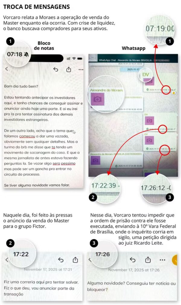 Conforme publicamos na quinta-feira, inicialmente a informação obtida pela equipe da coluna era de que Vorcaro havia entrado em contato com Moraes uma única vez, no início da manhã do dia 17. Só após a publicação da primeira matéria obtivemos a íntegra da comunicação entre os dois.