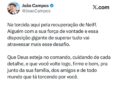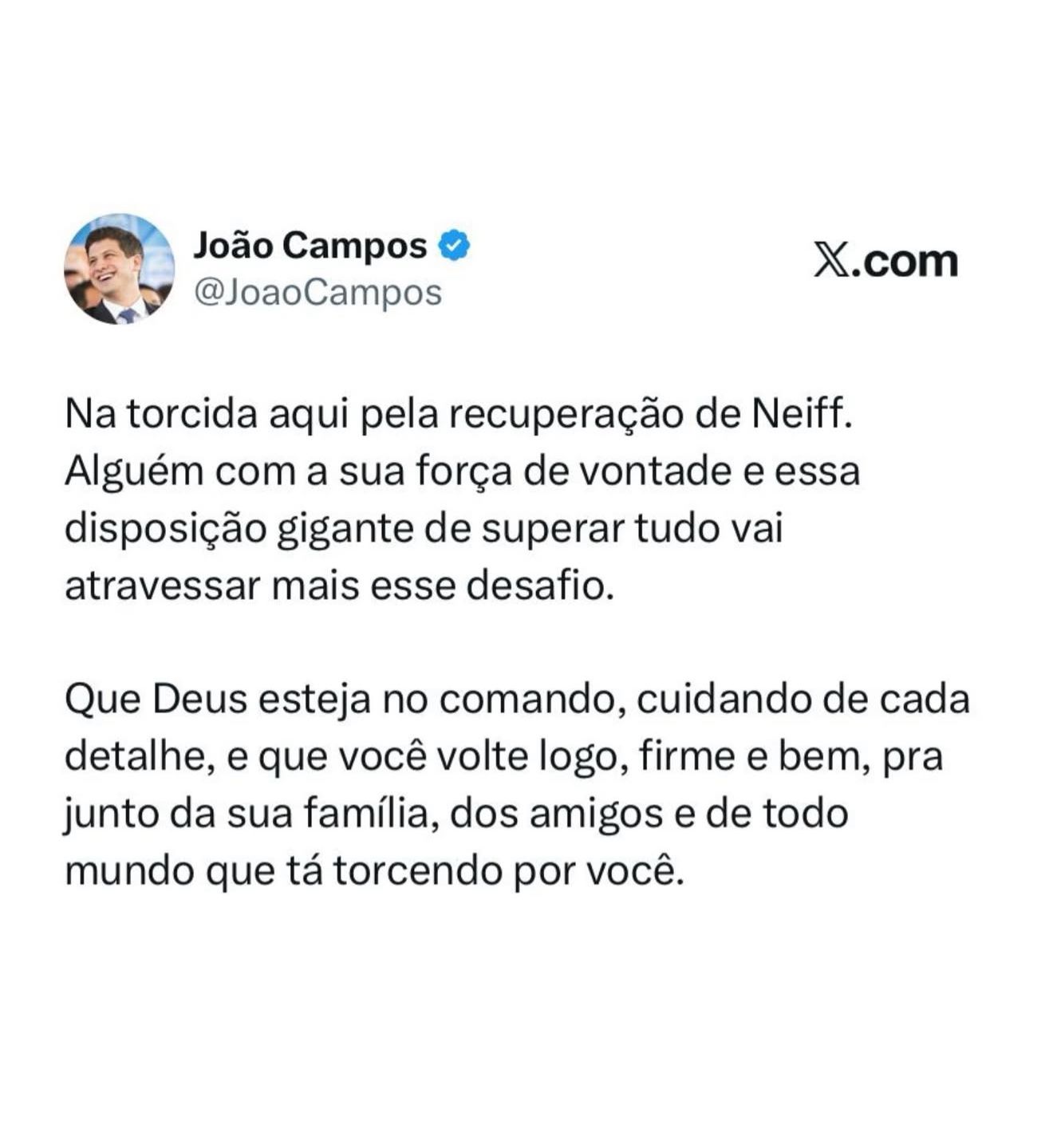 Em publicação nas redes sociais, João Campos escreveu: “Na torcida aqui pela recuperação de Neiff. Alguém com a sua força de vontade e essa disposição gigante de superar tudo vai atravessar mais esse desafio. Que Deus esteja no comando, cuidando de cada detalhe, e que você volte logo, firme e bem, pra junto da sua família, dos amigos e de todo mundo que tá torcendo por você”.