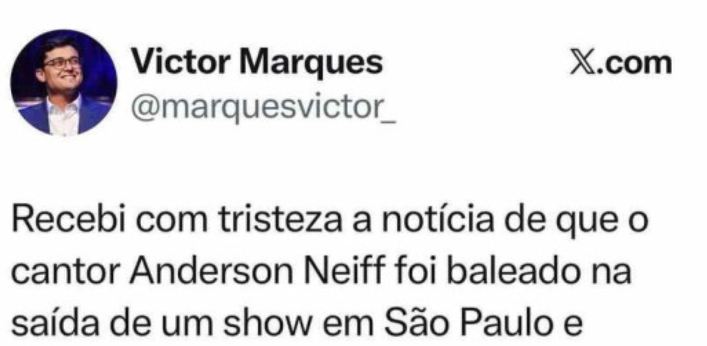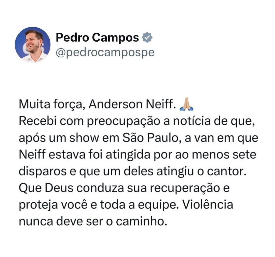 Já Pedro Campos declarou: “Muita força, Anderson Neiff. Recebi com preocupação a notícia de que, após um show em São Paulo, a van em que Neiff estava foi atingida por ao menos sete disparos e que um deles atingiu o cantor. Que Deus conduza sua recuperação e proteja você e toda a equipe. Violência nunca deve ser o caminho”.