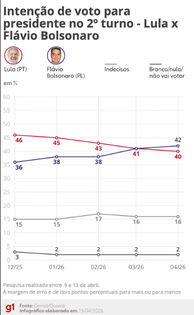 O levantamento foi encomendado pela Genial Investimentos e ouviu 2.004 pessoas com 16 anos ou mais entre os dias 9 e 13 de abril. A margem de erro é de dois pontos percentuais para mais ou para menos, e o nível de confiança é de 95%. O registro da pesquisa no TSE é BR-09285/2026.