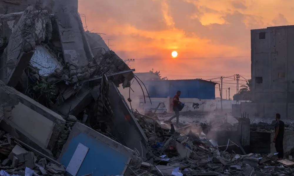 Prédio destruído é visto na Faixa de Gaza após retaliação de Israel
