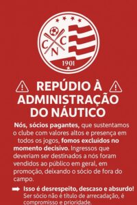 Ser sócio não pode ser apenas um título vazio ou uma forma de arrecadação, mas sim um compromisso de reciprocidade, respeito e prioridade. Exigimos que o Clube Náutico Capibaribe reveja urgentemente sua postura e restabeleça a valorização e o respeito ao seu maior patrimônio: seus sócios torcedores.”