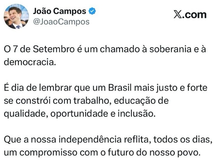 No Instagram, Campos escreveu: “O 7 de Setembro é um chamado à soberania e à democracia. É dia de lembrar que um Brasil mais justo e forte se constrói com trabalho, educação de qualidade, oportunidade e inclusão. Que a nossa independência reflita, todos os dias, um compromisso com o futuro do nosso povo.”