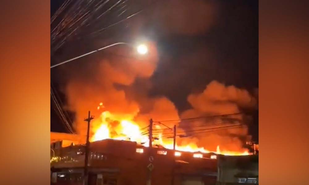 As chamas começaram por volta das 23h40 do domingo (7). Imagens mostram as altas chamas que tomaram conta do local e a forte fumaça que se espalhou.