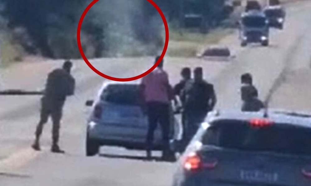 No vídeo, também é possível ouvir tiros sendo disparados junto ao automóvel e observar a fumaça. Um homem com uma arma longa quebra partes do veículo.