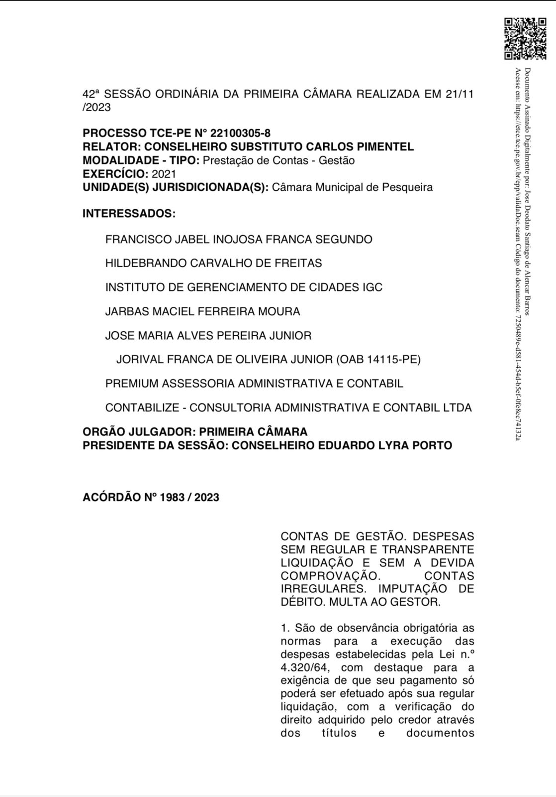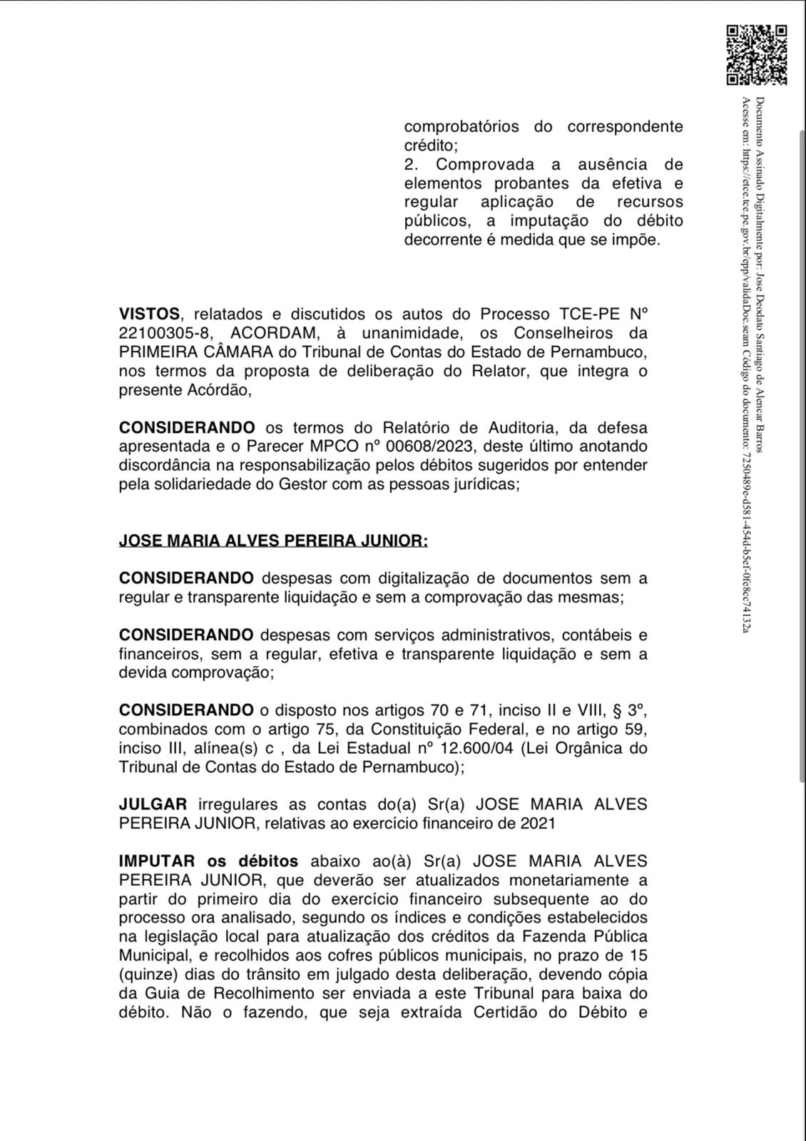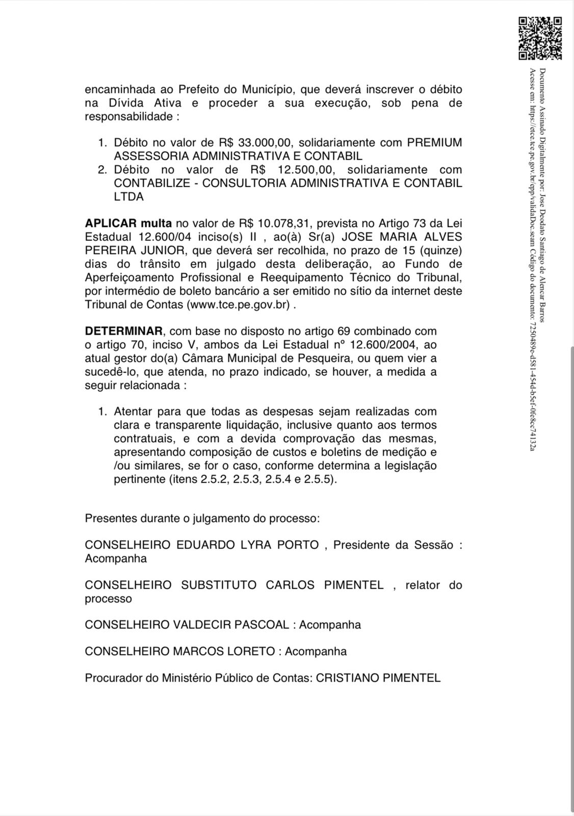 Por Luiz Roberto Marinho – O Tribunal de Contas do Estado de Pernambuco (TCE-PE) negou nesta quarta-feira (10) recurso do vereador José Maria Alves Pereira Júnior, conhecido como Pastinha Xukuru (PP), manteve a rejeição de suas contas quando presidiu a Câmara Municipal de Pesqueira, no Agreste, em 2021, e, em consequência, sua inelegibilidade por oito anos.