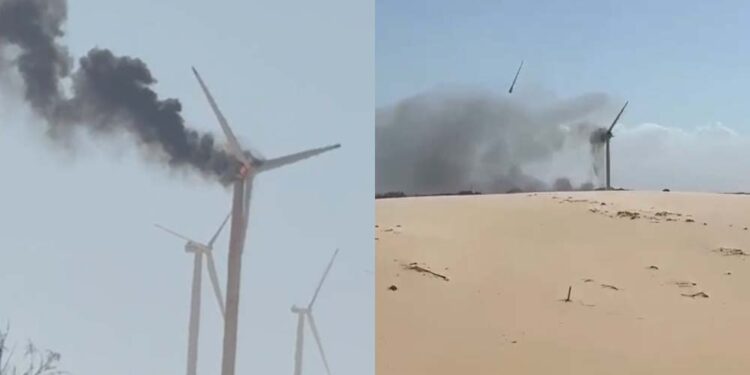 Do G1 — Uma turbina do Parque Eólico Cumbe pegou fogo nesta sexta-feira (22). Testemunhas filmaram o equipamento pegando fogo enquanto funcionava até que as pás eólicas se soltam. A usina fica em Aracati, no litoral do Ceará, a cerca de 155 km de Fortaleza.