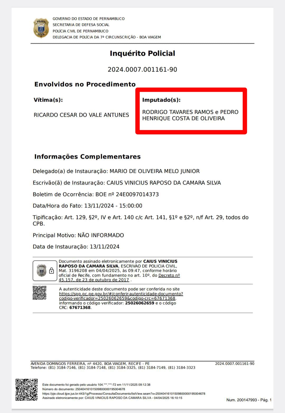 Ricardo Antunes foi agredido no dia 13 de novembro de 2024, ao sair da barbearia Trois, em Boa Viagem. Foi atacado pelas costas por Pedro Henrique Costa de Oliveira com um soco, caiu e continuou sendo espancado.