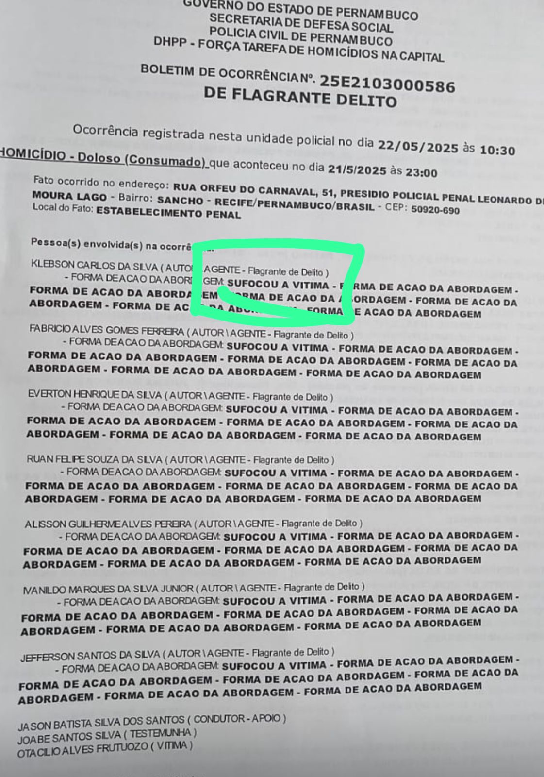 O BO (boletim de ocorrência), ao qual o Blog teve acesso com exclusividade, autuou em flagrante, como executores do ex-chaveiro, sete detentos: Klebson Carlos da Silva, Fabrício Alves Ferreira, Everton Henrique da Silva, Ruan Felipe Souza da Silva, Alisson Guilherme Alves Pereira, Ivanildo Marques da Silva Junior e Jefferson Santos da Silva.