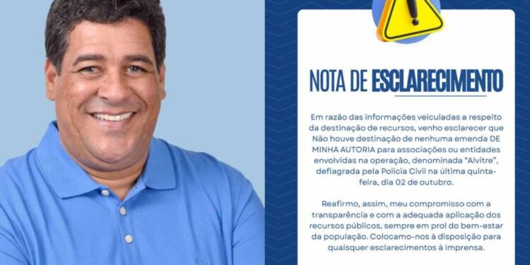 “Em razão das informações veiculadas a respeito da destinação de recursos, venho esclarecer que não houve destinação de nenhuma emenda DE MINHA AUTORIA para associações ou entidades envolvidas na operação, denominada “Alvitre”, deflagrada pela Polícia Civil na última quinta-feira, dia 02 de outubro.